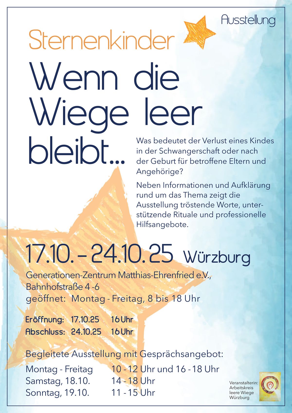 Würzburg (POW) Die Wanderausstellung „Sternenkinder. Wenn die Wiege leer bleibt…“ wird am Freitag, 17. Oktober, um 16 Uhr im Matthias-Ehrenfried-Haus in Würzburg eröffnet. „Die Ausstellung macht sichtbar, was der Verlust eines Kindes in der Schwangerschaft oder nach der Geburt für betroffene Eltern und Angehörige bedeutet. Neben Informationen und Aufklärung rund um das Thema zeigt sie tröstende Worte für Betroffene und Angehörige sowie unterstützende Rituale und professionelle Hilfsangebote in der Region Würzburg“, schreibt der Arbeitskreis „Leere Wiege“.