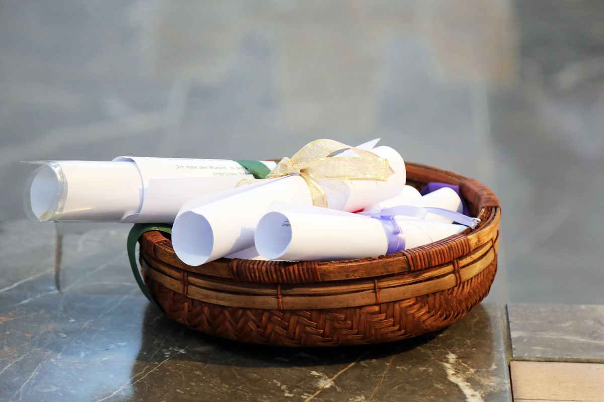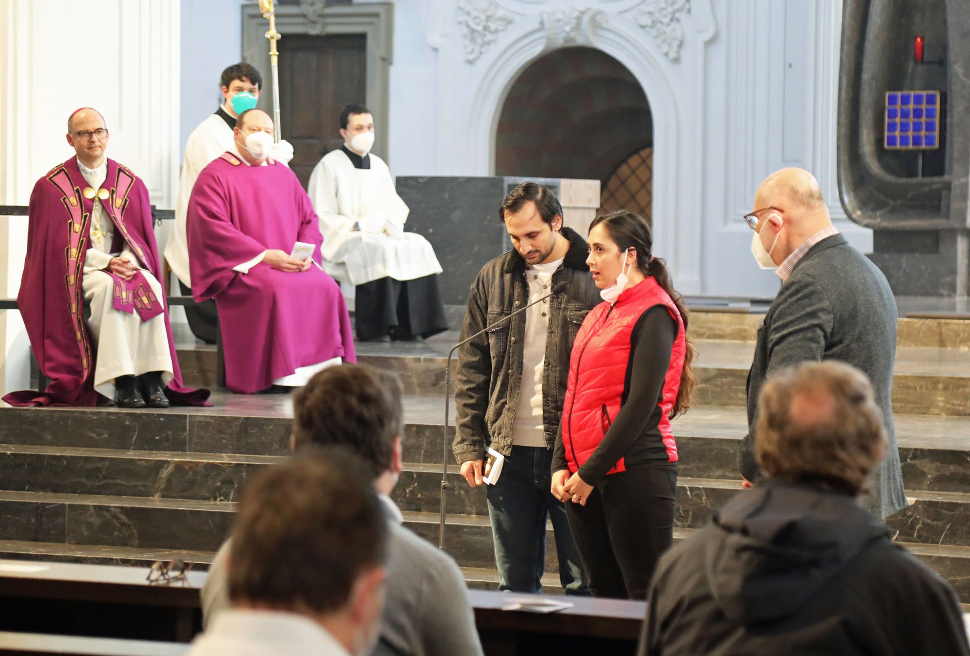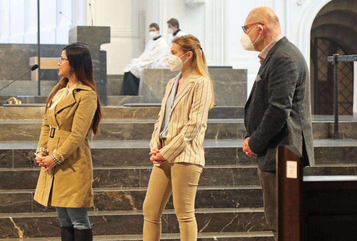 Auf unterschiedlichen Wegen haben die Bewerber zur katholischen Kirche gefunden. Sie habe durch den Glauben inneren Frieden gefunden, erzählte eine Bewerberin. Nach einem schweren familiären Schicksalsschlag fand eine andere Bewerberin Halt im Glauben. Sie sei erst in Deutschland in Kontakt mit dem Christentum gekommen, erzählte eine Studentin aus Asien: „2020 habe ich angefangen, die Bibel richtig zu lesen und zu beten. Ich bin so dankbar dafür.“ Eine andere junge Frau erzählte, dass sie als Teenager sehr schwierig gewesen sei. Doch jemand habe sie nicht aufgegeben, so sei sie auf den Weg zu Gott gekommen. Für eine Altenpflegerin war der Kontakt mit den ihr anvertrauten alten und sterbenden Menschen der Auslöser, sich mit dem Glauben zu beschäftigen. „Ich habe schon immer geglaubt“, sagte ein Mann. Er hole jetzt seine Taufe nach, weil er Verantwortung für seine Familie übernehmen wolle auf der Basis des christlichen Glaubens. Nach dem Tod ihrer Mutter habe sie zufällig den Weg zu einer Gemeinde gefunden, erzählte eine Frau. „Auf einmal hatte ich wieder einen inneren Kompass. Dafür bin ich sehr dankbar. Ich möchte der Gemeinschaft etwas zurückgeben als Dank dafür, dass sie mich aufgefangen hat.“