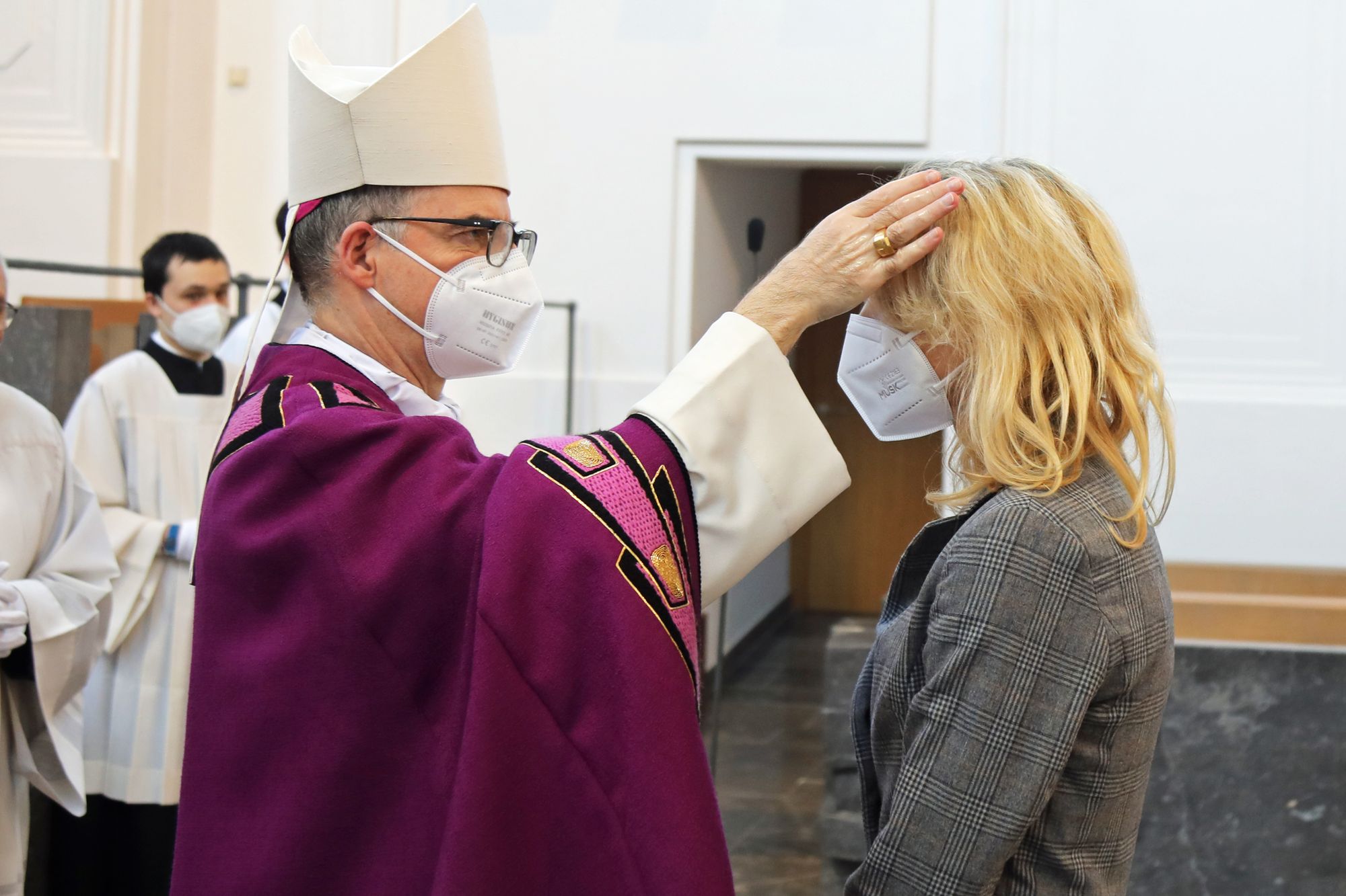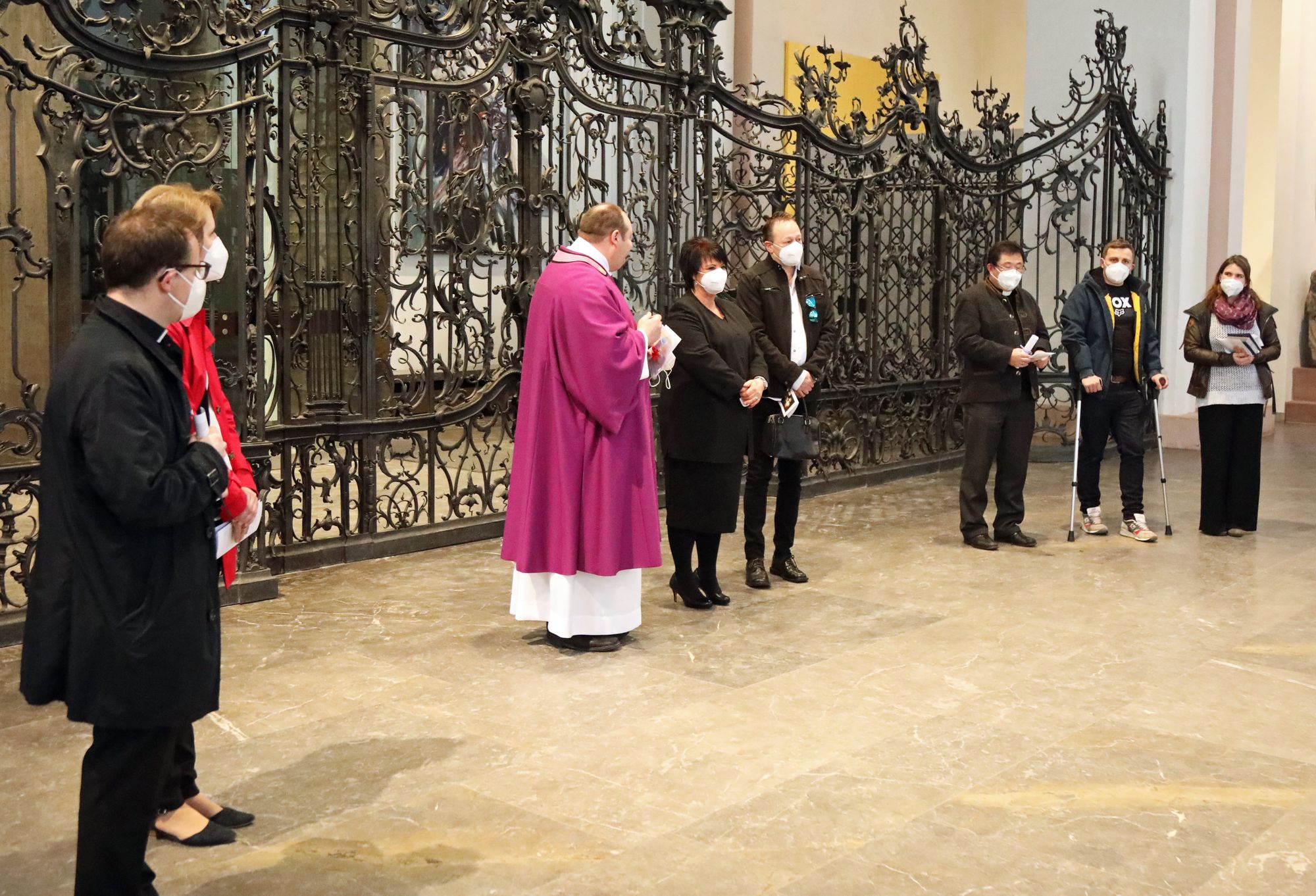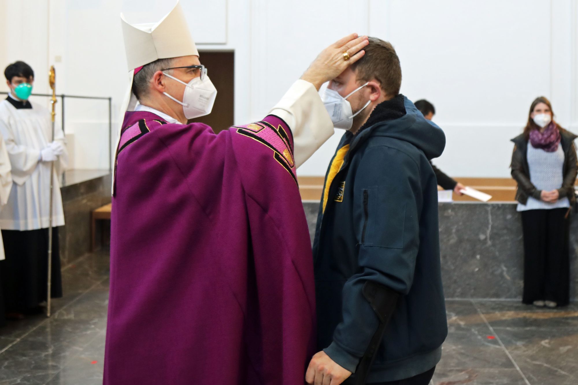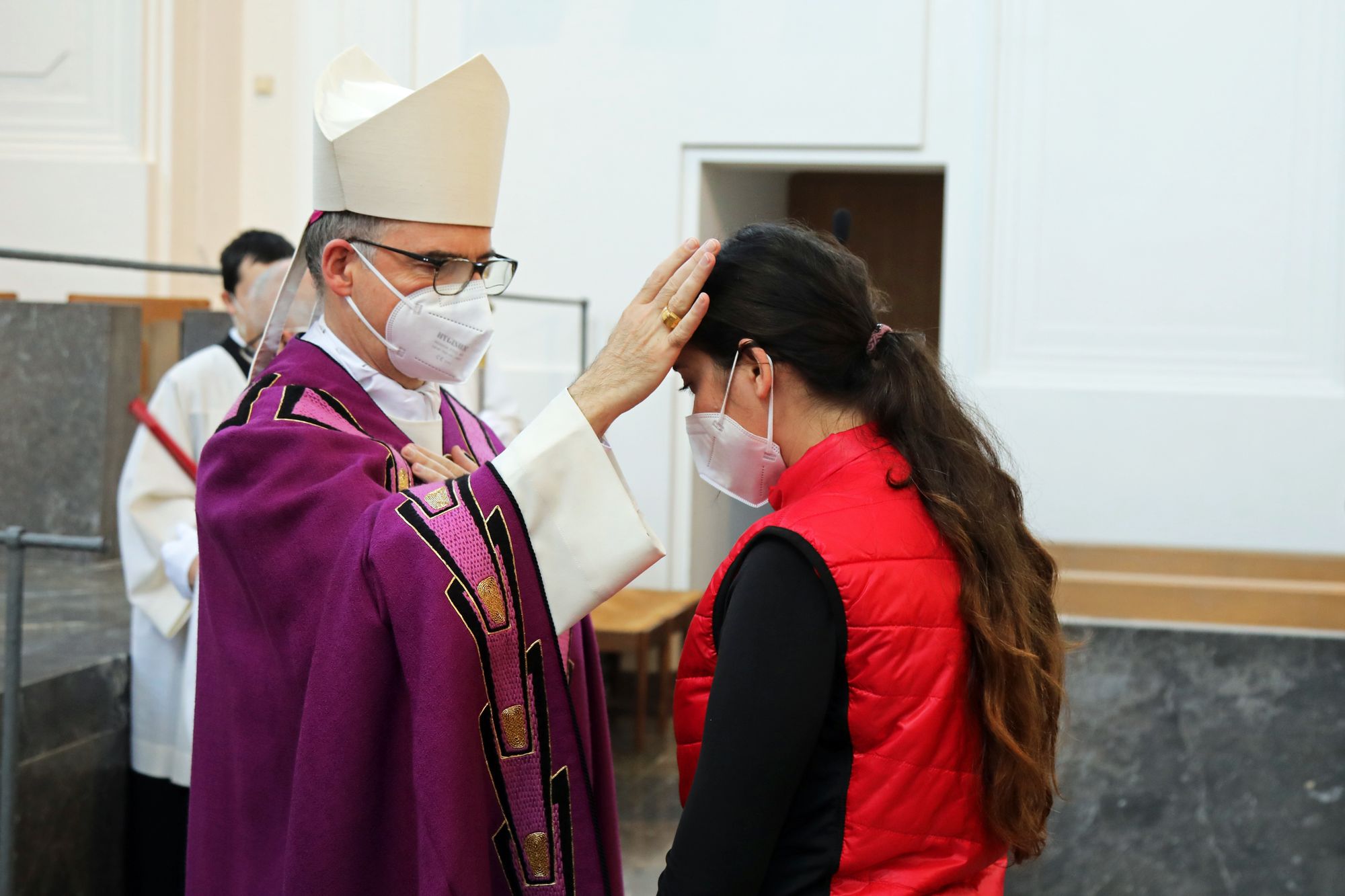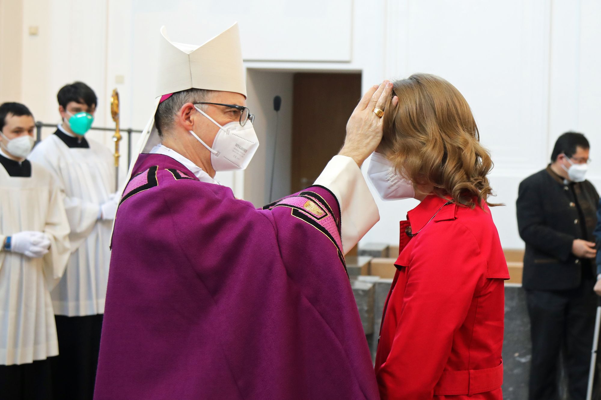 Würzburg (POW) Insgesamt sechs Frauen und ein Mann aus fünf Pfarreien und Pfarreiengemeinschaften der Diözese Würzburg möchten in die katholische Kirche aufgenommen werden. Ihnen erteilte Bischof Dr. Franz Jung am Sonntag, 21. Februar, im Würzburger Kiliansdom die Zulassung zu Taufe, Firmung und Eucharistie. Der Bischof salbte ihnen dazu unter Beachtung der Corona-Hygienemaßnahmen die Stirn mit Katechumenenöl und segnete sie. Nach mindestens einem Jahr der Vorbereitung werden sie an Ostern oder in der Osterzeit in ihren Heimatgemeinden in die Gemeinschaft der Kirche aufgenommen.