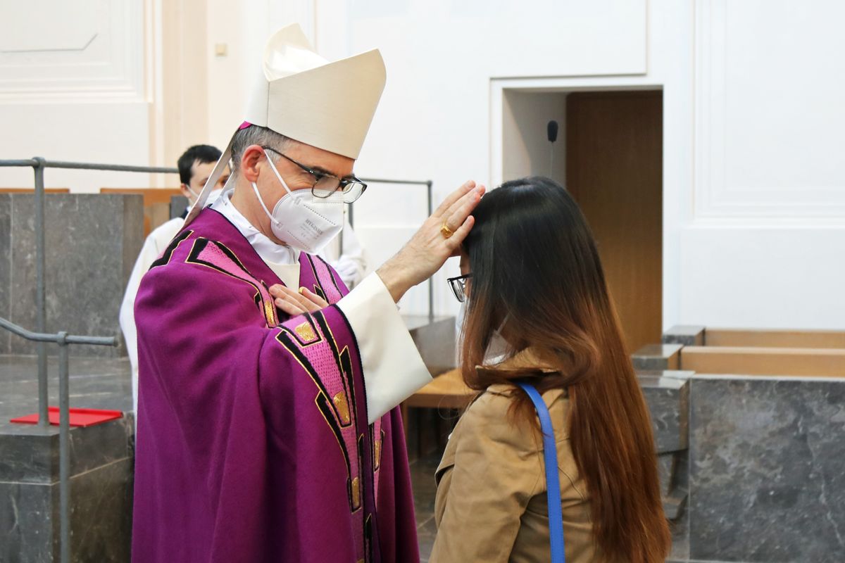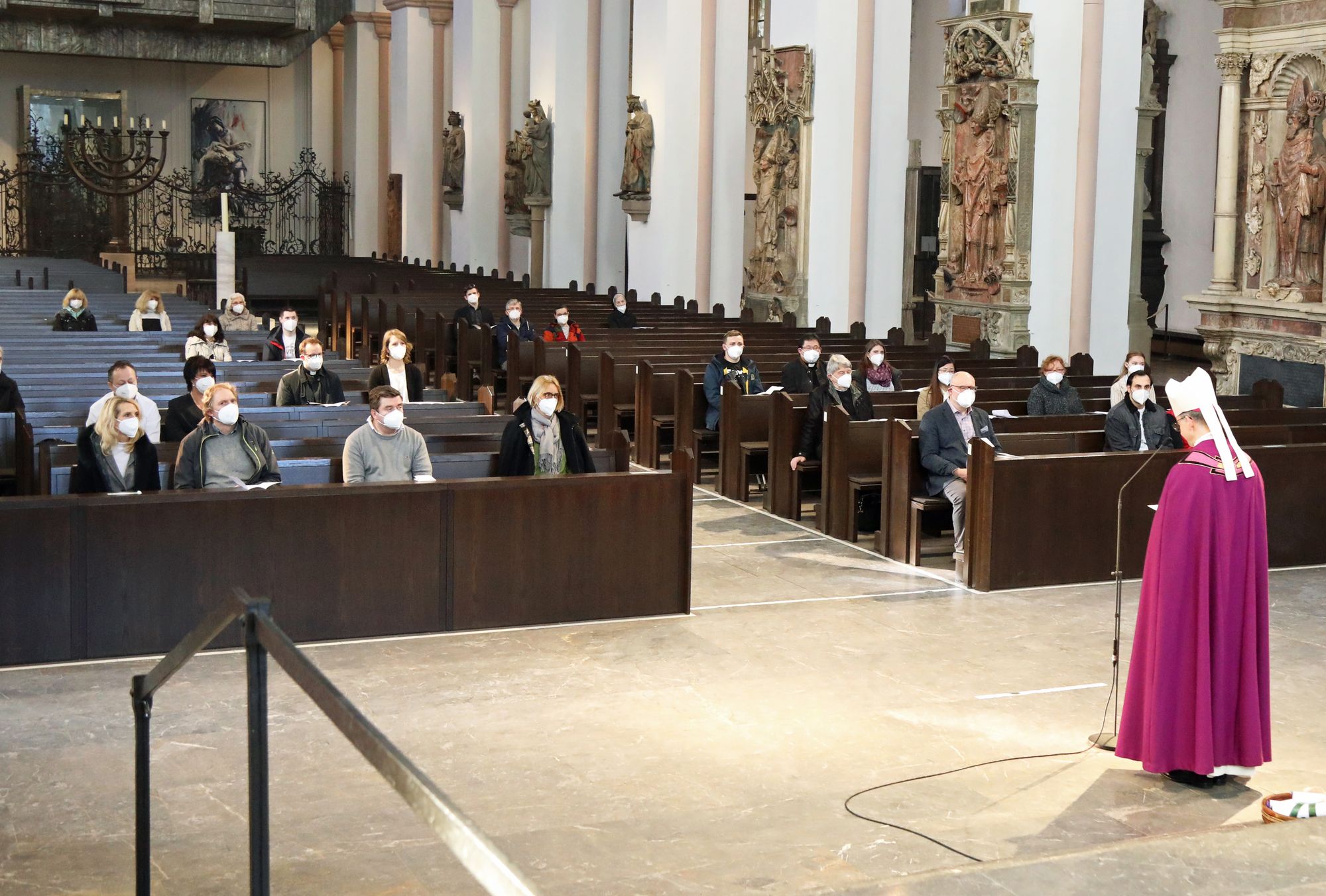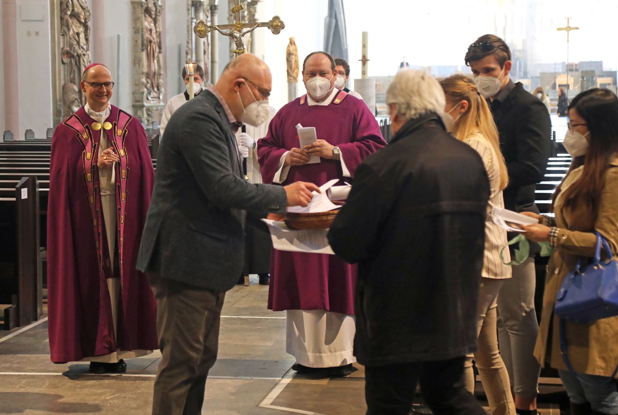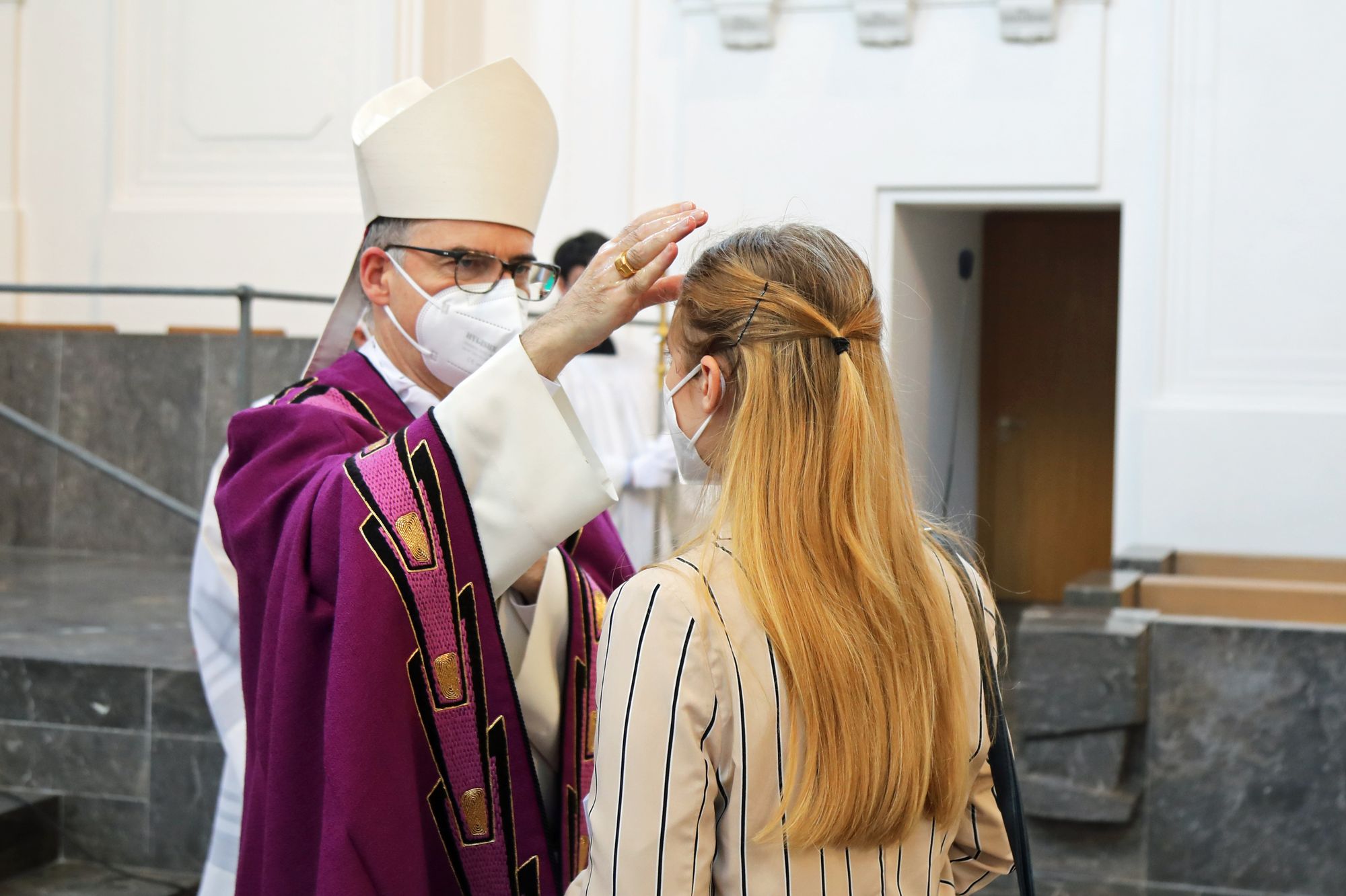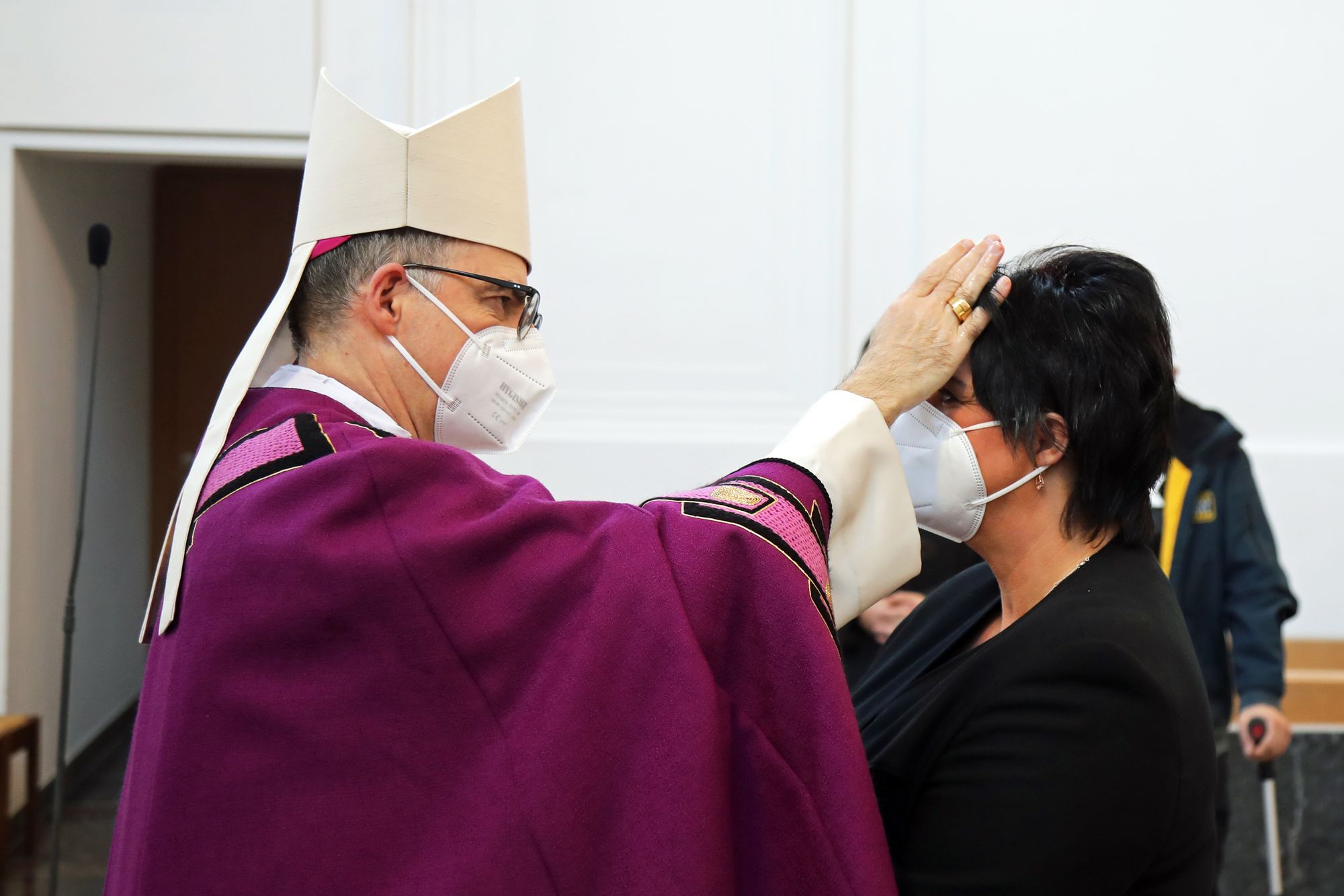 Würzburg (POW) Insgesamt sechs Frauen und ein Mann aus fünf Pfarreien und Pfarreiengemeinschaften der Diözese Würzburg möchten in die katholische Kirche aufgenommen werden. Ihnen erteilte Bischof Dr. Franz Jung am Sonntag, 21. Februar, im Würzburger Kiliansdom die Zulassung zu Taufe, Firmung und Eucharistie. Der Bischof salbte ihnen dazu unter Beachtung der Corona-Hygienemaßnahmen die Stirn mit Katechumenenöl und segnete sie. Nach mindestens einem Jahr der Vorbereitung werden sie an Ostern oder in der Osterzeit in ihren Heimatgemeinden in die Gemeinschaft der Kirche aufgenommen.