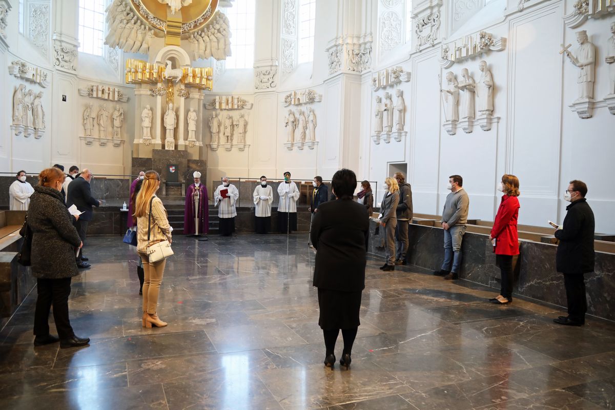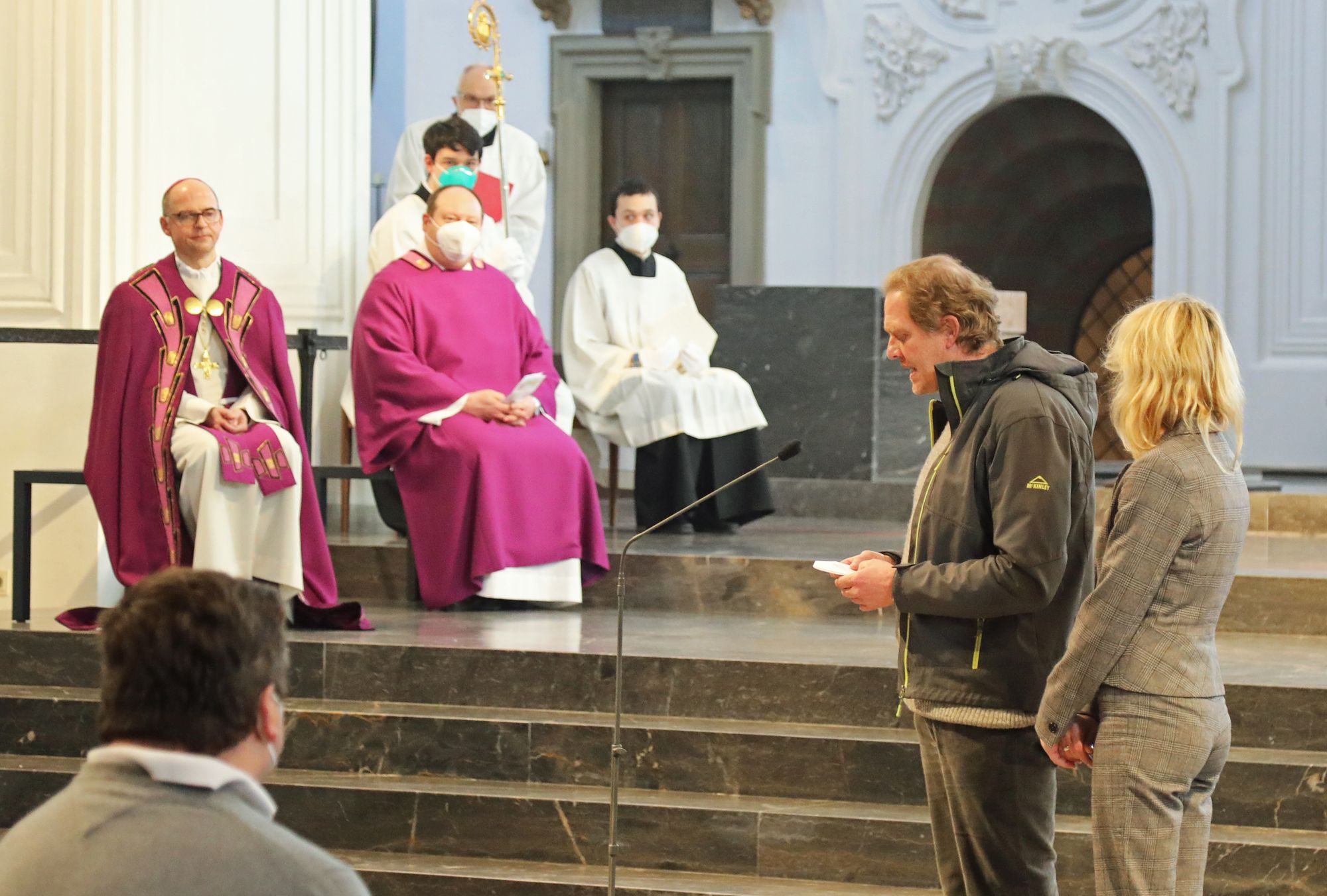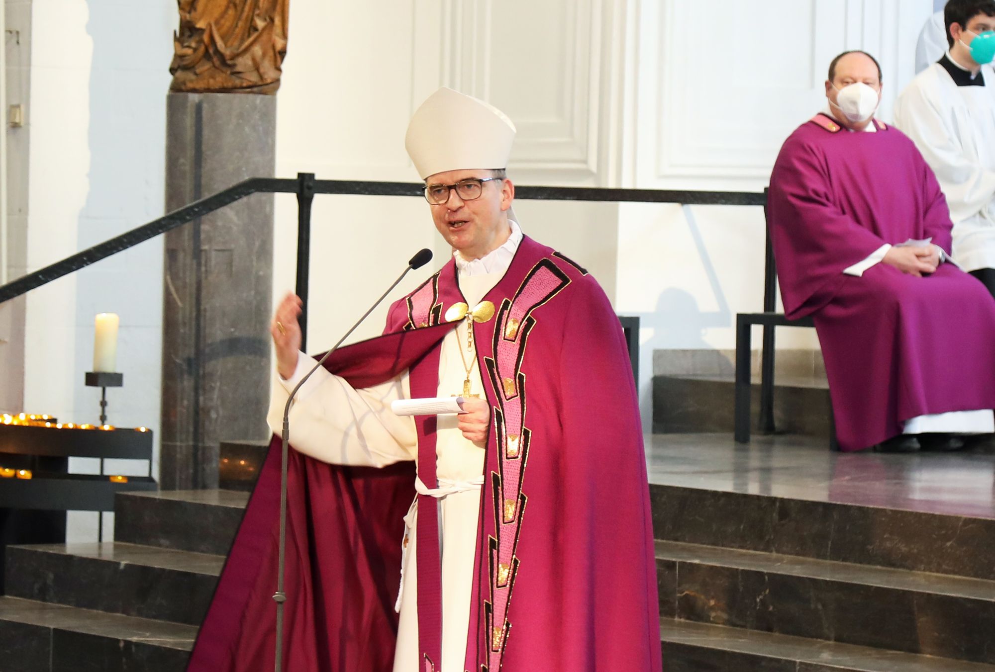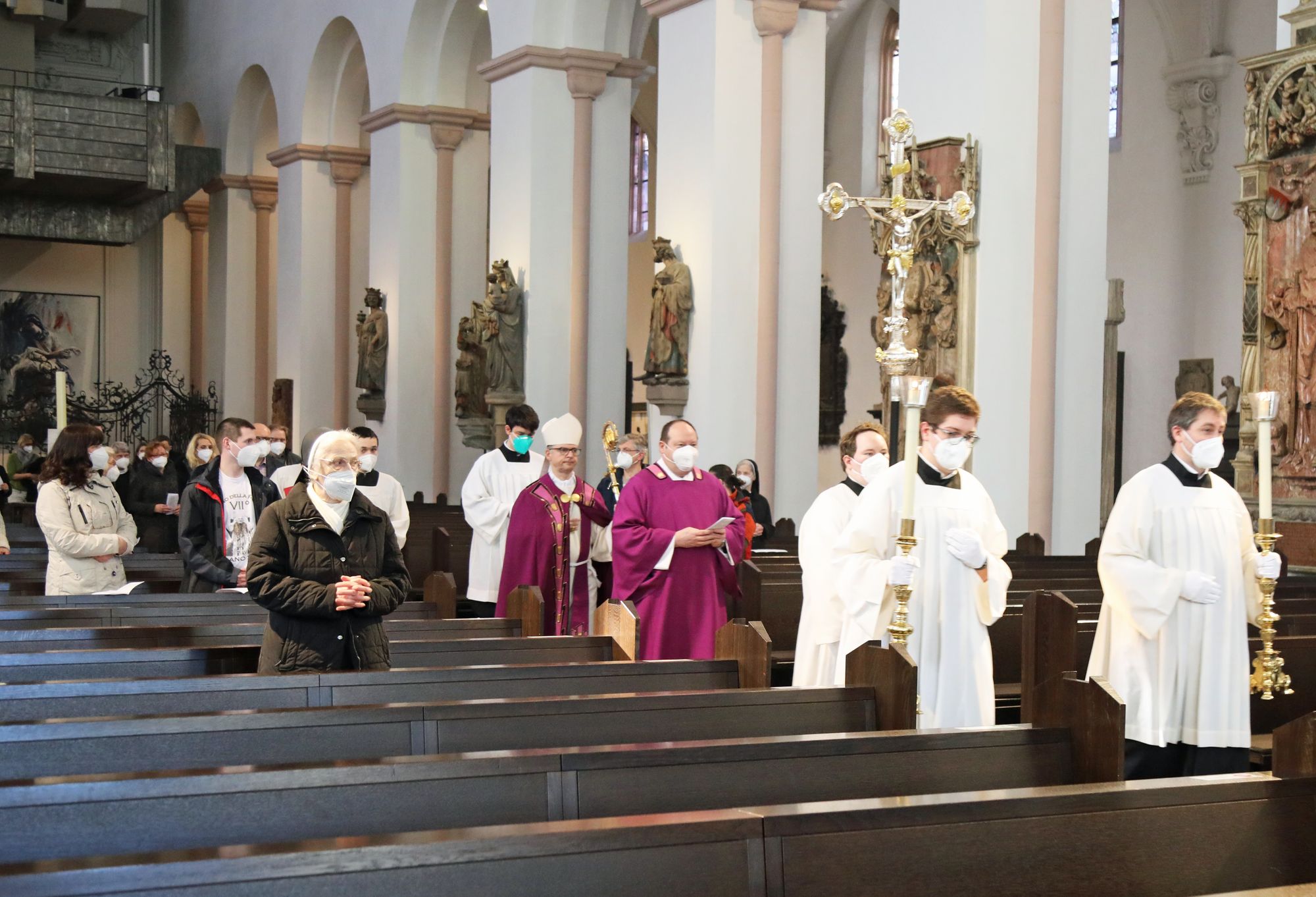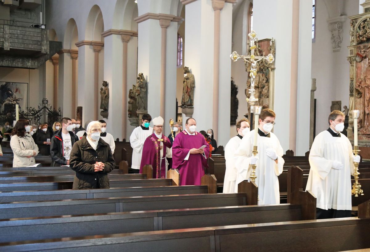 Würzburg (POW) Insgesamt sechs Frauen und ein Mann aus fünf Pfarreien und Pfarreiengemeinschaften der Diözese Würzburg möchten in die katholische Kirche aufgenommen werden. Ihnen erteilte Bischof Dr. Franz Jung am Sonntag, 21. Februar, im Würzburger Kiliansdom die Zulassung zu Taufe, Firmung und Eucharistie. Der Bischof salbte ihnen dazu unter Beachtung der Corona-Hygienemaßnahmen die Stirn mit Katechumenenöl und segnete sie. Nach mindestens einem Jahr der Vorbereitung werden sie an Ostern oder in der Osterzeit in ihren Heimatgemeinden in die Gemeinschaft der Kirche aufgenommen.