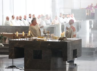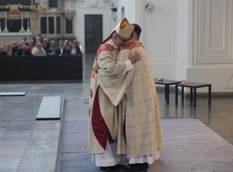 In seiner Predigt legte Bischof Jung das Emmaus-Evangelium als Anleitung für den diakonalen Dienst aus. Zentrales Thema sei die Kunst der Seelsorge: Dazu gehöre unter anderem, Geduld beim Zuhören zu haben. „Nicht jeder weiß genau zu formulieren, was ihn im Innersten bedrückt“, betonte Bischof Jung. Zentral sei der Blick auf die Eucharistie – als Quelle der Gnade und des neuen Lebens, das aus dem Kreuz hervorgeht. „Werdet Diener und Ausspender der Eucharistie,“ rief er den Weihekandidaten zu. Die Heilige Schrift gewinnt laut Bischof Jung ihre Kraft im gelebten Leben und den Widersprüchen, die dieses mit sich bringe. Er forderte die neuen Diakone auf, das Stundengebet treu zu verrichten: „Werdet Männer des Gebets, um mit Christus für das Volk Gottes zu beten.“ Zudem ermutigte er die beiden Männer, „das Feuer in den Herzen wieder neu zu entfachen“ und die Menschen aus der Lethargie zu befreien, indem sie diesen die Gnade Gottes zusprechen.