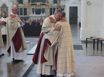 Würzburg (POW) Mitgehen, zuhören und den anderen in seiner Zerbrochenheit ernst nehmen. Das sind zentrale Aufgaben eines Diakons. Das hat Bischof Dr. Franz Jung bei der Diakonenweihe im Würzburger Kiliansdom am Samstag, 28. September, betont. „Wer wie Jesus mit den Emmausjüngern mitgeht und zuhört, wird oft beschenkt für sein Leben.“ Unter Handauflegung und Gebet weihte er Ansgar Kehrer (55) aus Aschaffenburg-Obernau zum Ständigen Diakon. Ebenso empfing Dr. Andy Theuer (34) aus Würzburg die Diakonenweihe, der auf dem Weg zur Priesterweihe ist.