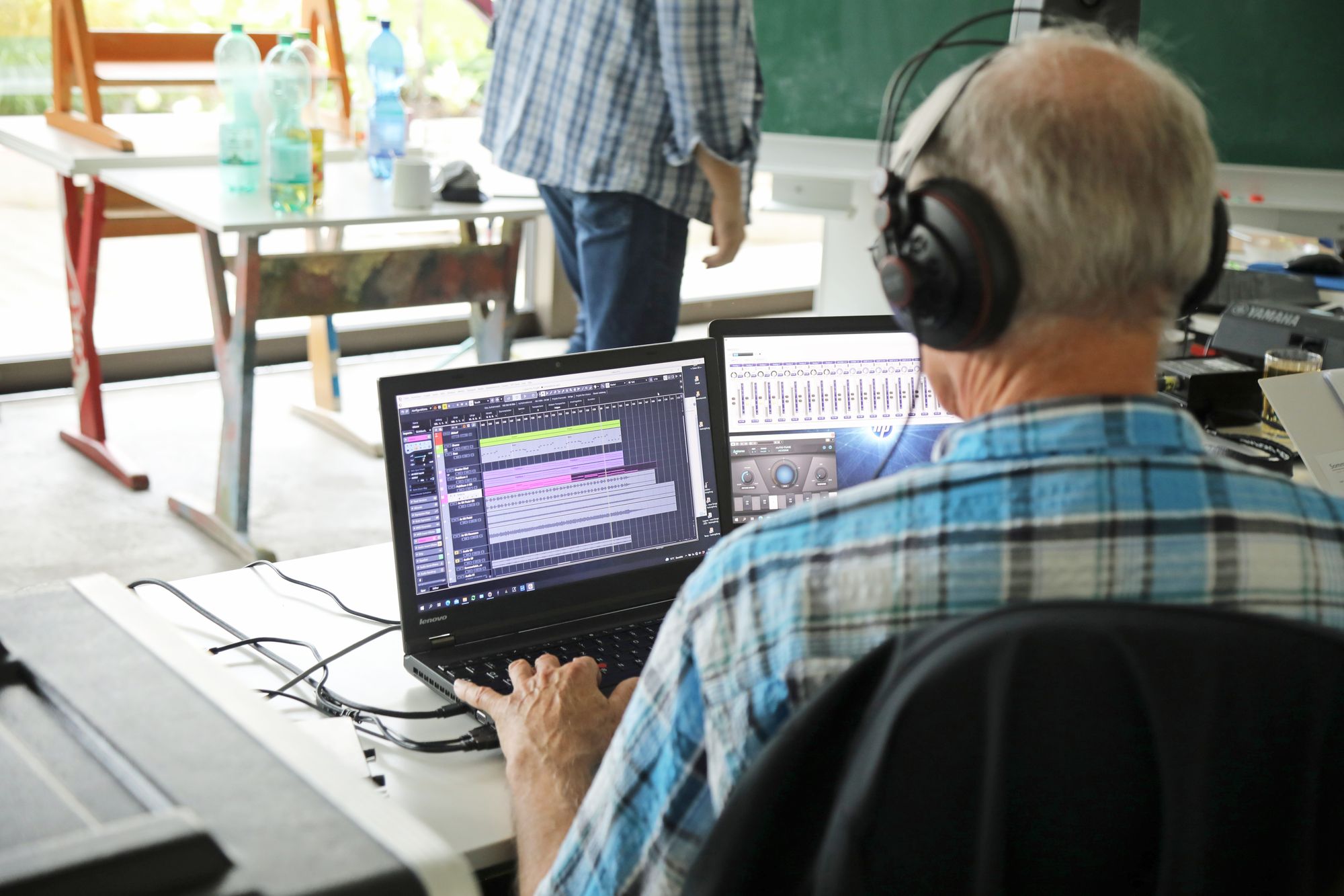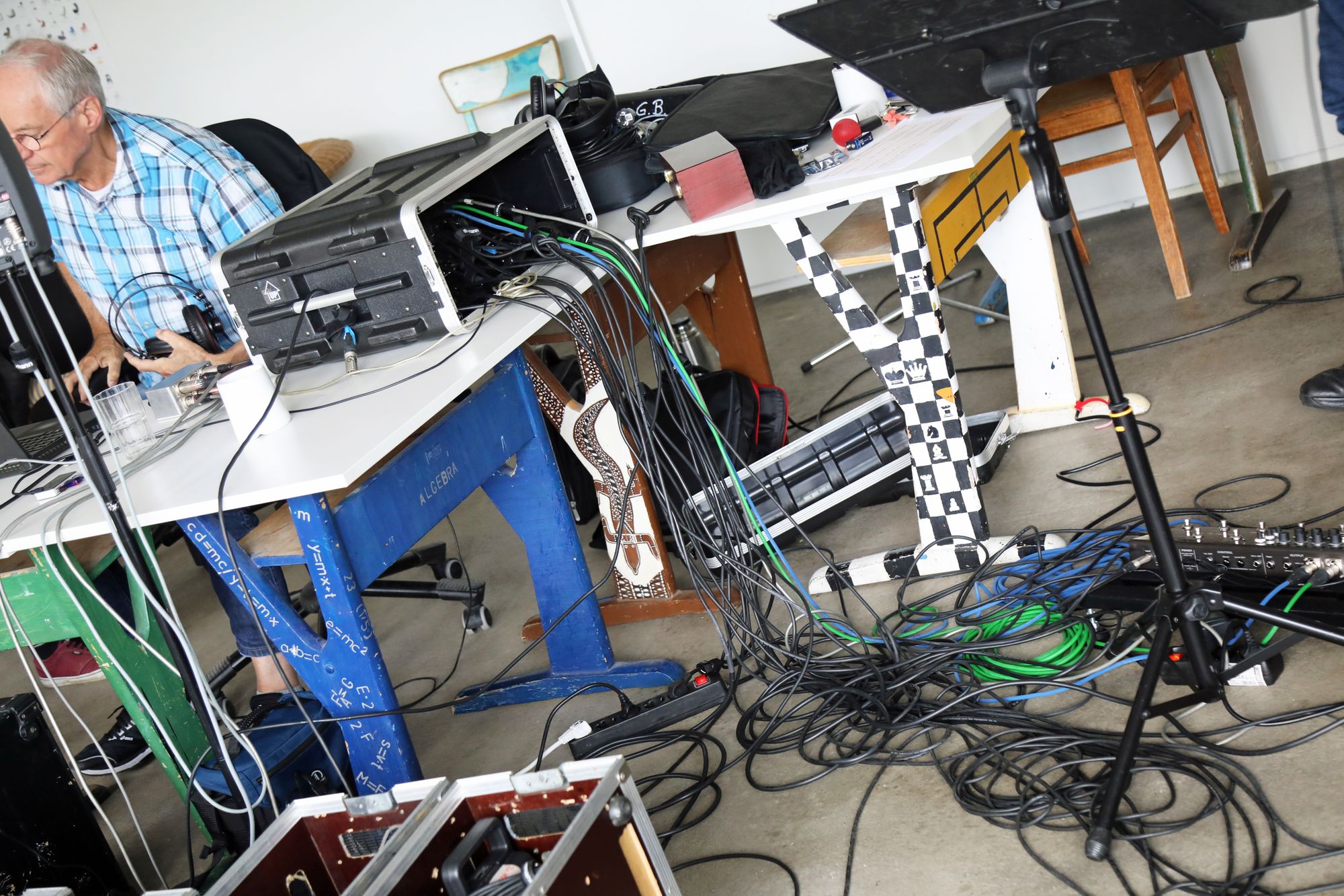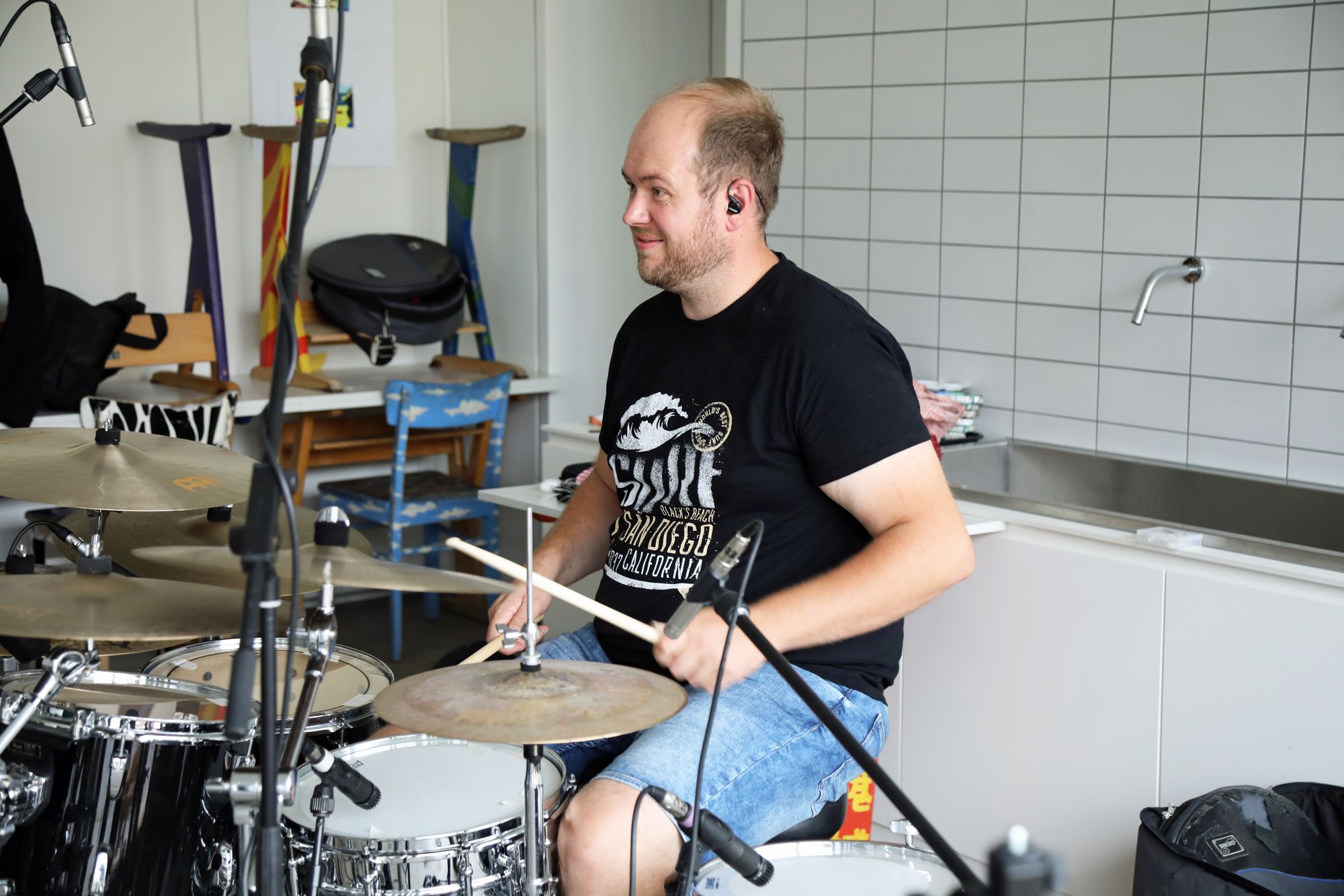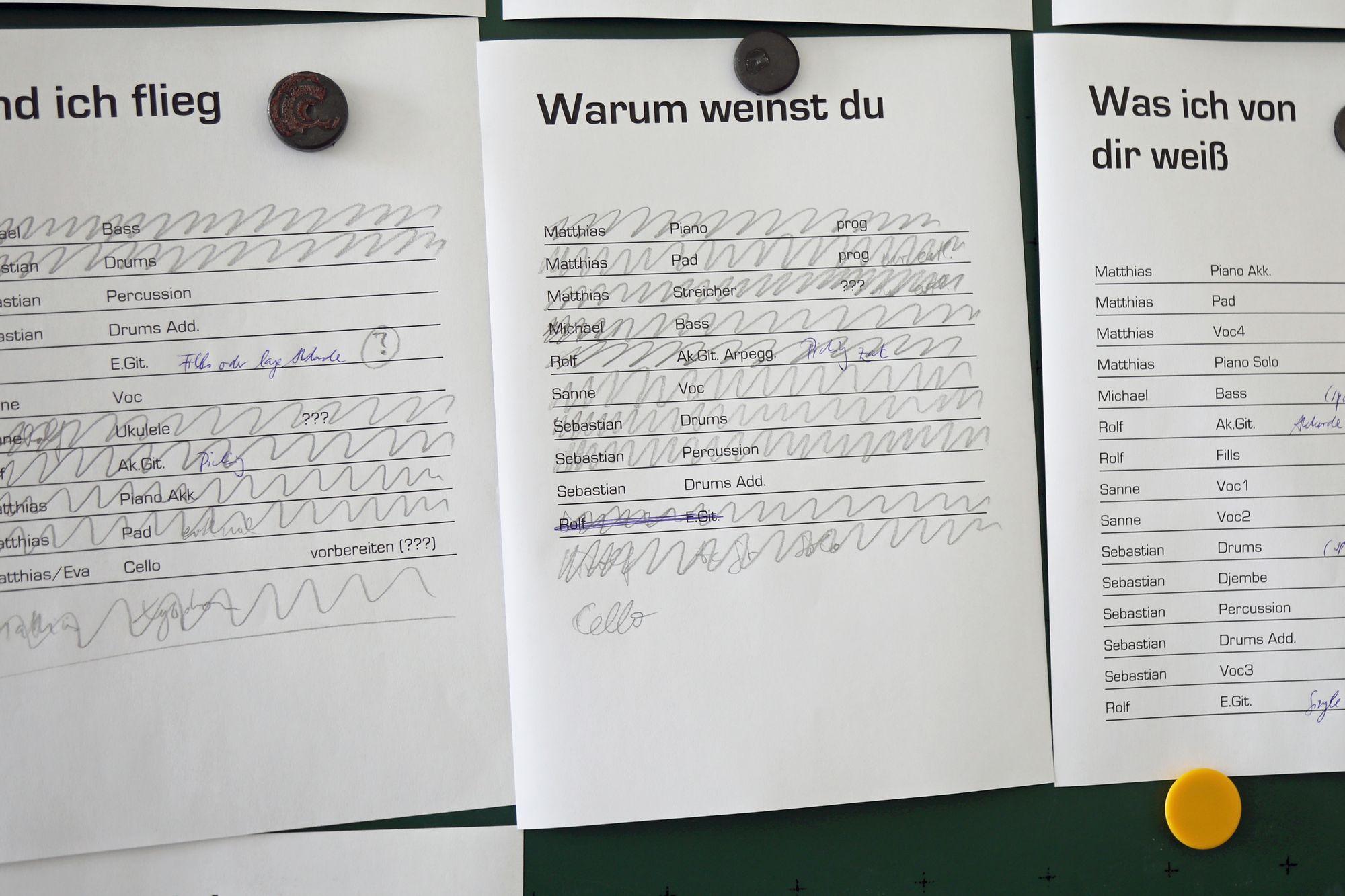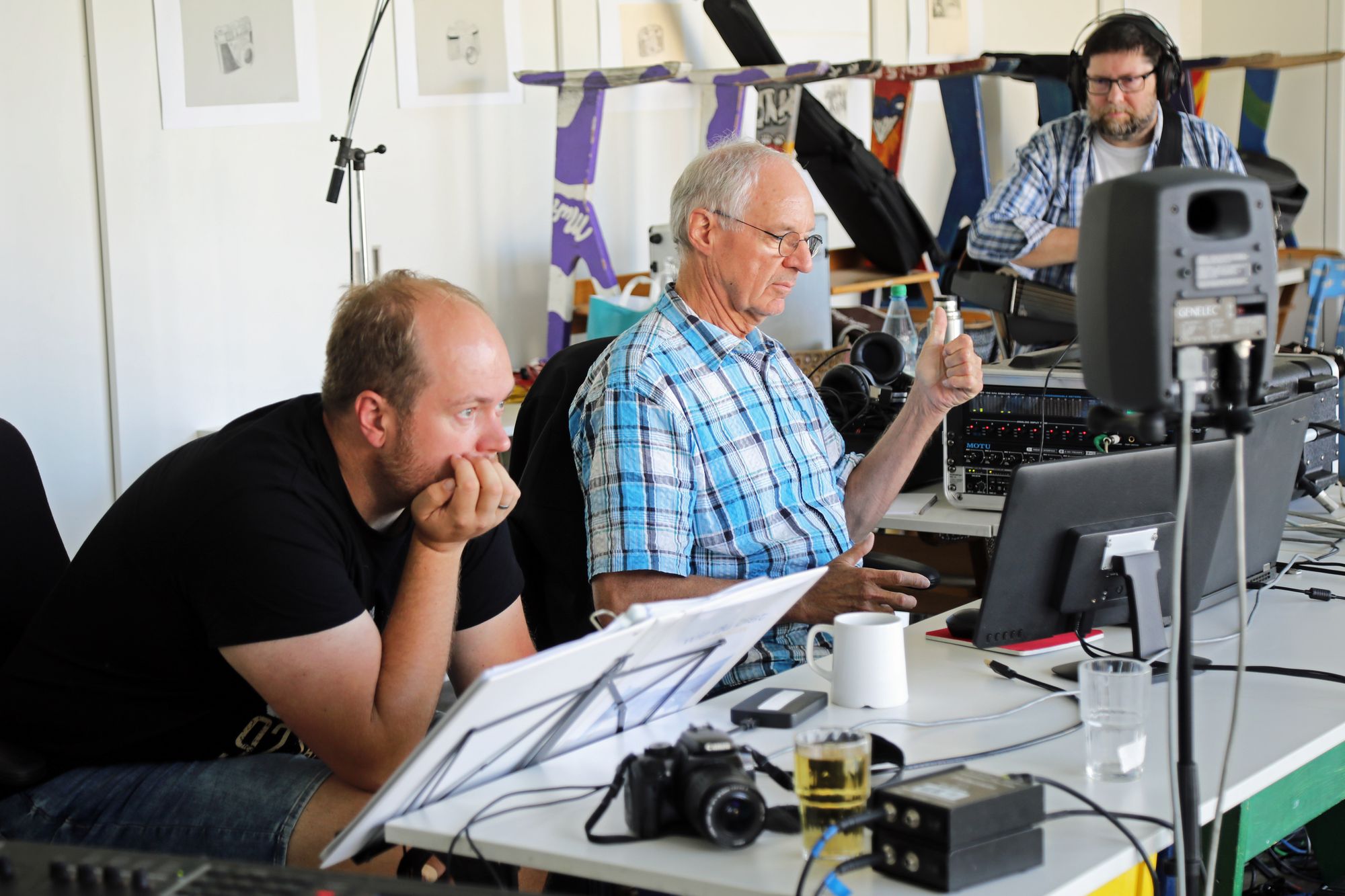 Genau acht Tage hat die Band Zeit, um alle Lieder einzuspielen. Das Egbert-Gymnasium in Münsterschwarzach hat dafür den Kunstraum zur Verfügung gestellt. In der Mitte des Raums sitzt Gerhard Barth am Mischpult. Der Toningenieur aus Wetzlar begleitet die Band seit ihrer ersten CD „größer“ aus dem Jahr 2009. Rechts steht ein Schlagzeug, links hängen an einer großen grünen Tafel die Einsatzpläne für die Aufnahmen – einmal aufgeschlüsselt nach Liedern und einmal für jedes Bandmitglied. Sebastian Volk streicht bei „Sommerleicht“ schwungvoll die Zeile „Akustik-Gitarre“ aus.