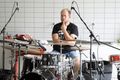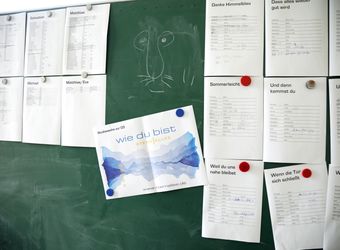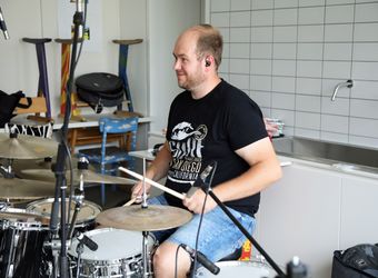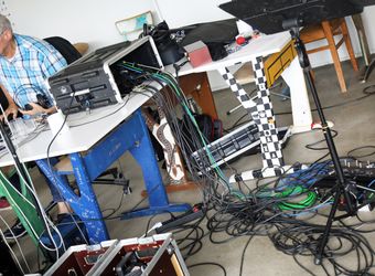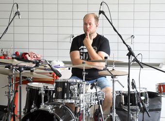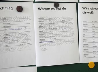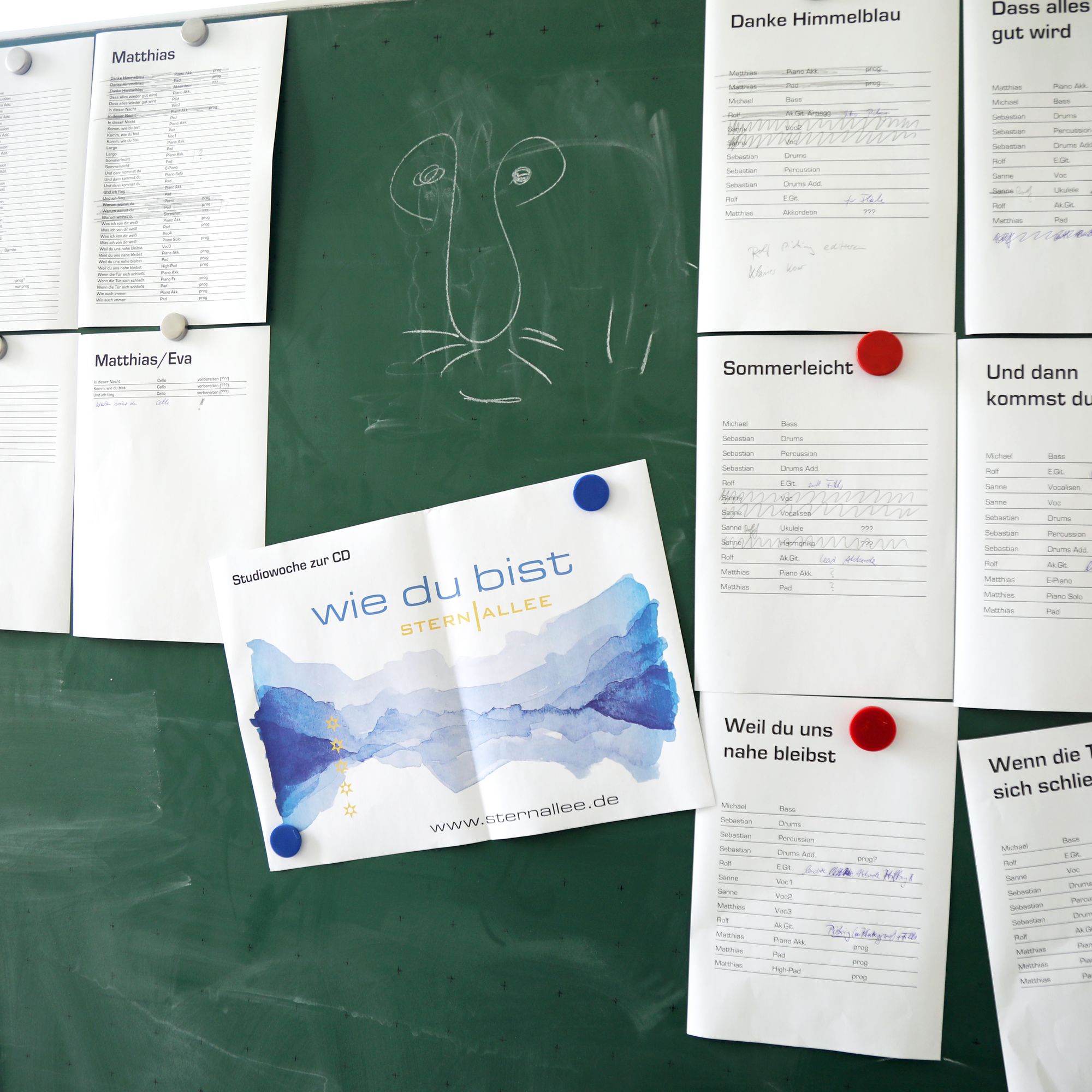 Genau acht Tage hat die Band Zeit, um alle Lieder einzuspielen. Das Egbert-Gymnasium in Münsterschwarzach hat dafür den Kunstraum zur Verfügung gestellt. In der Mitte des Raums sitzt Gerhard Barth am Mischpult. Der Toningenieur aus Wetzlar begleitet die Band seit ihrer ersten CD „größer“ aus dem Jahr 2009. Rechts steht ein Schlagzeug, links hängen an einer großen grünen Tafel die Einsatzpläne für die Aufnahmen – einmal aufgeschlüsselt nach Liedern und einmal für jedes Bandmitglied. Sebastian Volk streicht bei „Sommerleicht“ schwungvoll die Zeile „Akustik-Gitarre“ aus.