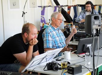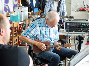Oder doch nicht? Beim gemeinsamen Anhören stellt Sebastian Volk mehr zu sich selbst fest: „Da fehlt irgendwie noch was.“ Wer die Ukulele dann ins Spiel bringt, ist im Nachhinein nicht mehr festzustellen. Rolf Wenner ist es nicht: „Ich kann keine Ukulele.“ „Die Ukulele würde gut passen, das unterstreicht die Atmosphäre nochmal“, ist Sebastian Volk überzeugt. Schließlich schnappt sich Gerhard Barth das Instrument und spielt konzentriert die gleichen vier Akkorde wie zuvor Wenner. „Selbst wenn man eine Vorstellung von einem Lied hat, kann es noch am Ende völlig anders klingen“, findet Matthias Gahr. Die Ukulele habe er nicht auf dem Plan gehabt. „Aber wenn Ideen kommen, werden sie gleich aufgenommen. Ich bin echt dankbar, dass ich so kreative Musiker habe.“