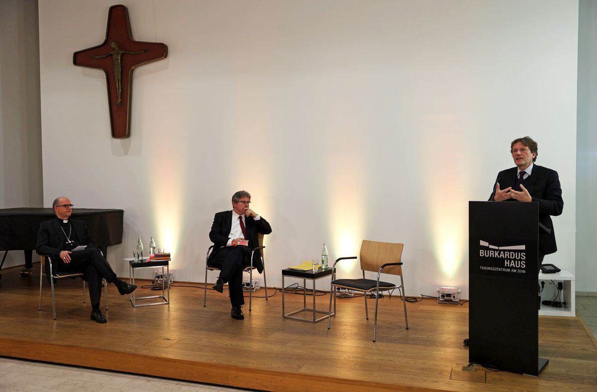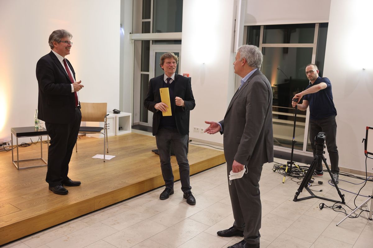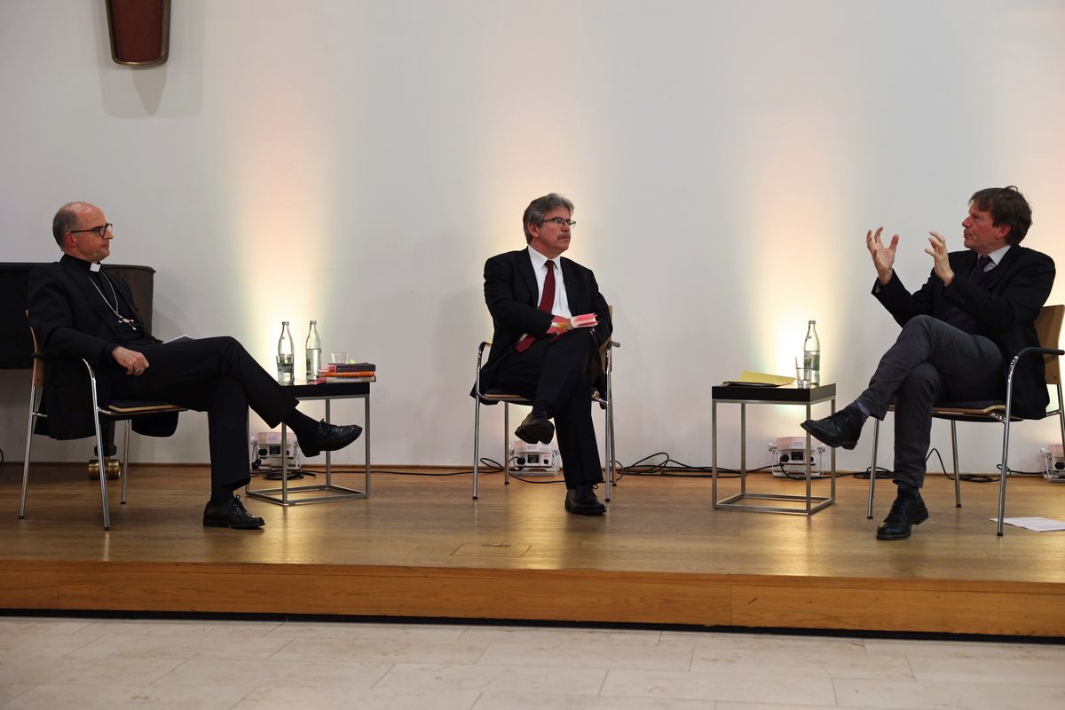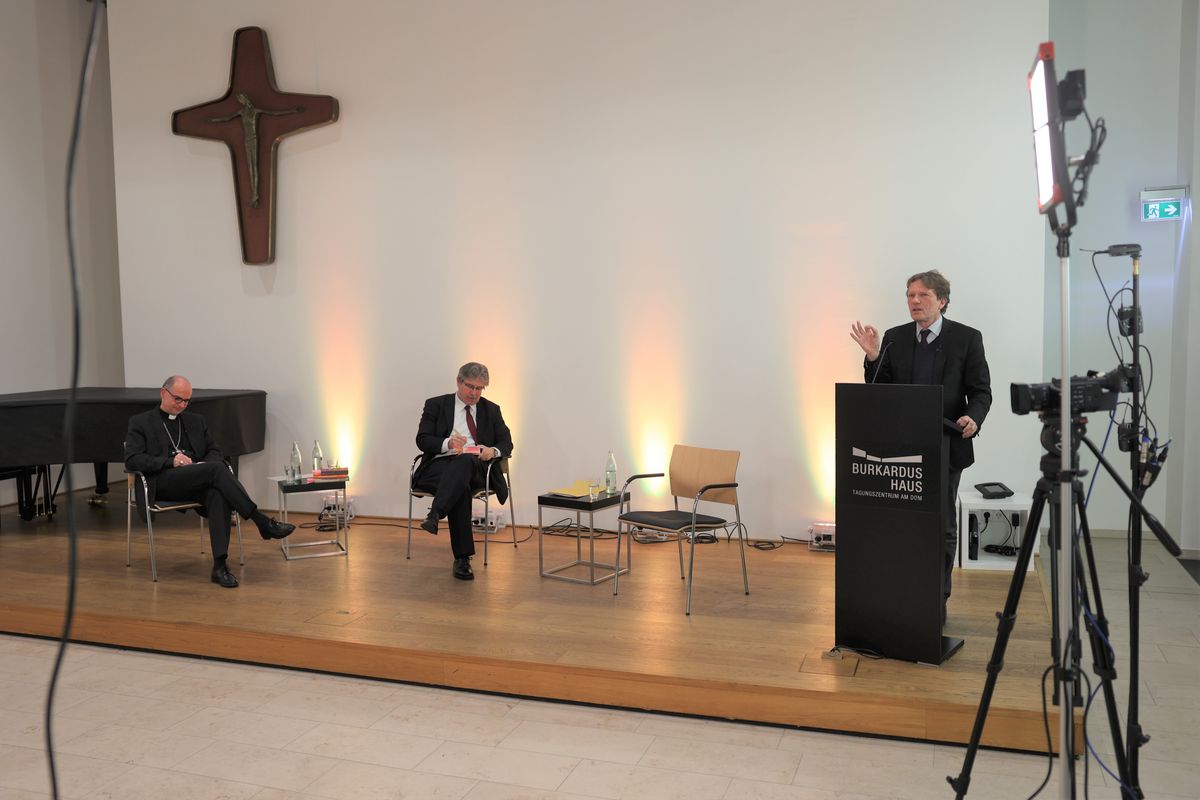 Im Anschluss an den Vortrag von Professor Dr. Hartmut Rosa (rechts) diskutierte Bischof Dr. Franz Jung (links) mit diesem. Moderiert wurde das Gespräch von Professor Dr. Jörn Müller (Mitte).