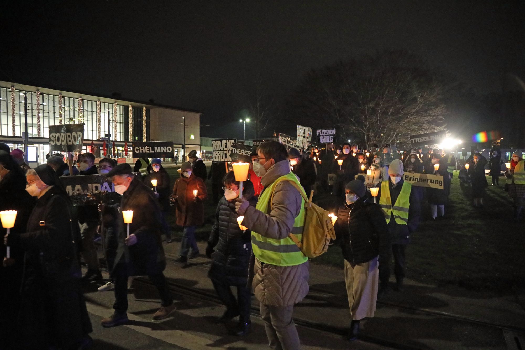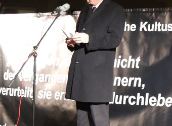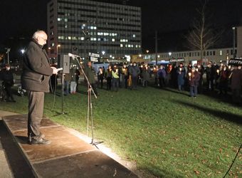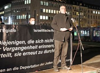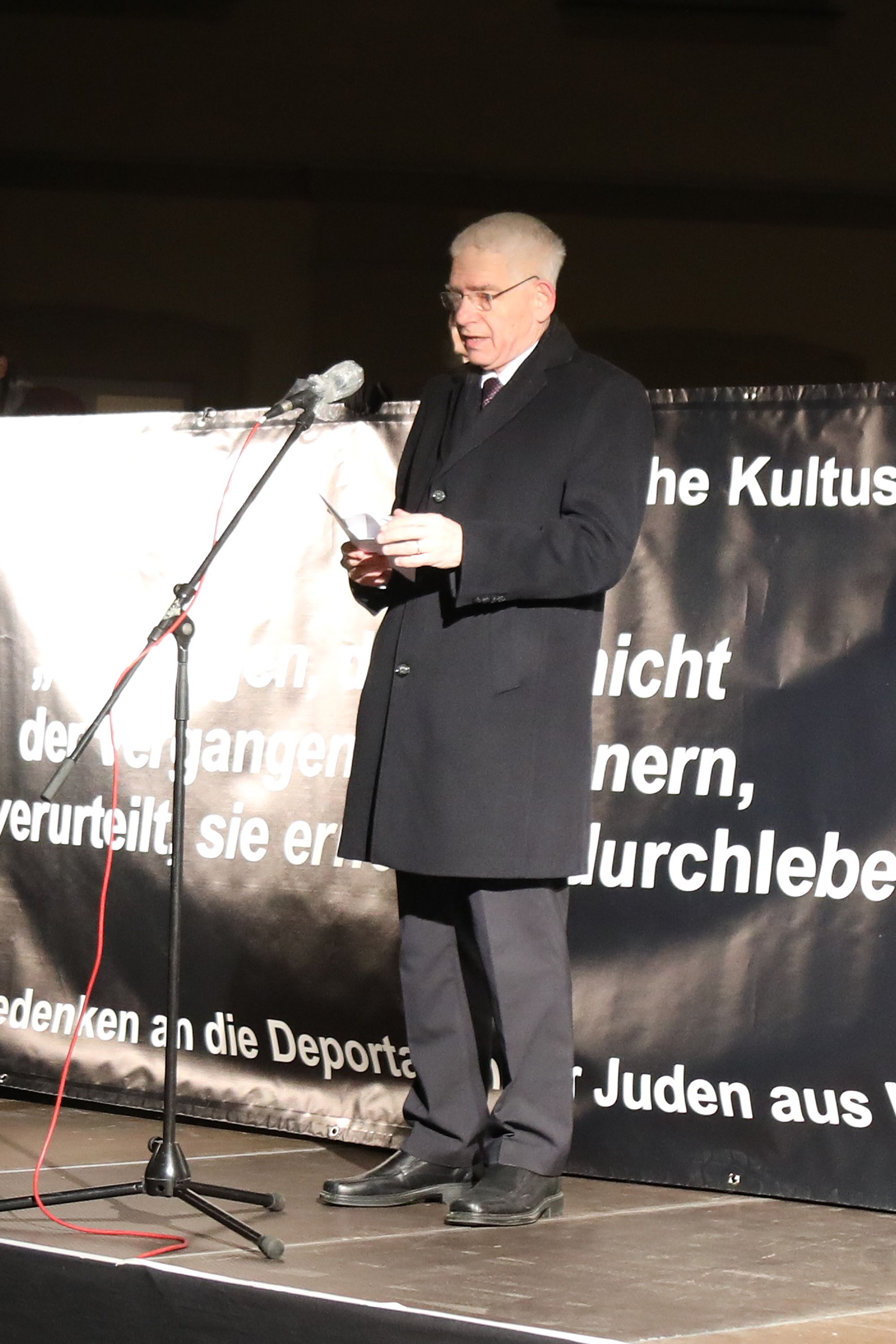 Wenn man an die Opfer dieser ersten Deportation denke, könne man den Weg „nur schweigend gehen“, sagte der evangelisch-lutherische Dekan Dr. Wenrich Slenczka. „Gespenstisch muss es gewesen sein in der Nacht, als über 200 jüdische Menschen durch unsere Straßen getrieben wurden. In der Nacht, weil es ein Verbrechen war und die Täter sich dessen bewusst waren.“ Die Menschen hätten weggesehen, aus Hass, Angst oder Gleichgültigkeit. „Wir müssen uns überlegen, wo wir stehen“, forderte Slenczka die Teilnehmenden auf. „Schauen wir weg, wenn Verbrechen an Menschen geschehen? Haben wir gelernt aus der Geschichte?“