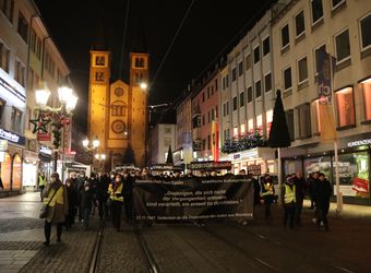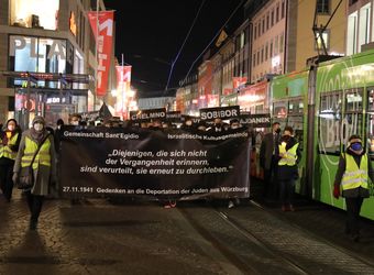 Vor 80 Jahren seien 202 Würzburger Juden bei Nacht und Kälte durch die Stadt getrieben worden, sagte Schuster. Sie wurden nach Schirotawa bei Riga gebracht. Nur 16 von ihnen überlebten. Doch die Verfolgung der Juden sei bereits 1938 sichtbar gewesen. „Sie wurden ihres Eigentums, ihrer Wohnungen und Häuser beraubt.“ Es seien keine Proteste von Seiten der deutschen Bevölkerung gegen diese Vorgänge bekannt. „Ich bin der Gemeinschaft Sant’Egidio dankbar, dass sie die Erinnerung an diese schrecklichen Ereignisse wachhält, und jedem Würzburger, der sich diesem Gang anschließt. Gerade jetzt, wo der Antisemitismus in der Mitte der Gesellschaft angekommen ist, bin ich dankbar, dass wir uns auf die Solidarität unserer Freunde verlassen können.“