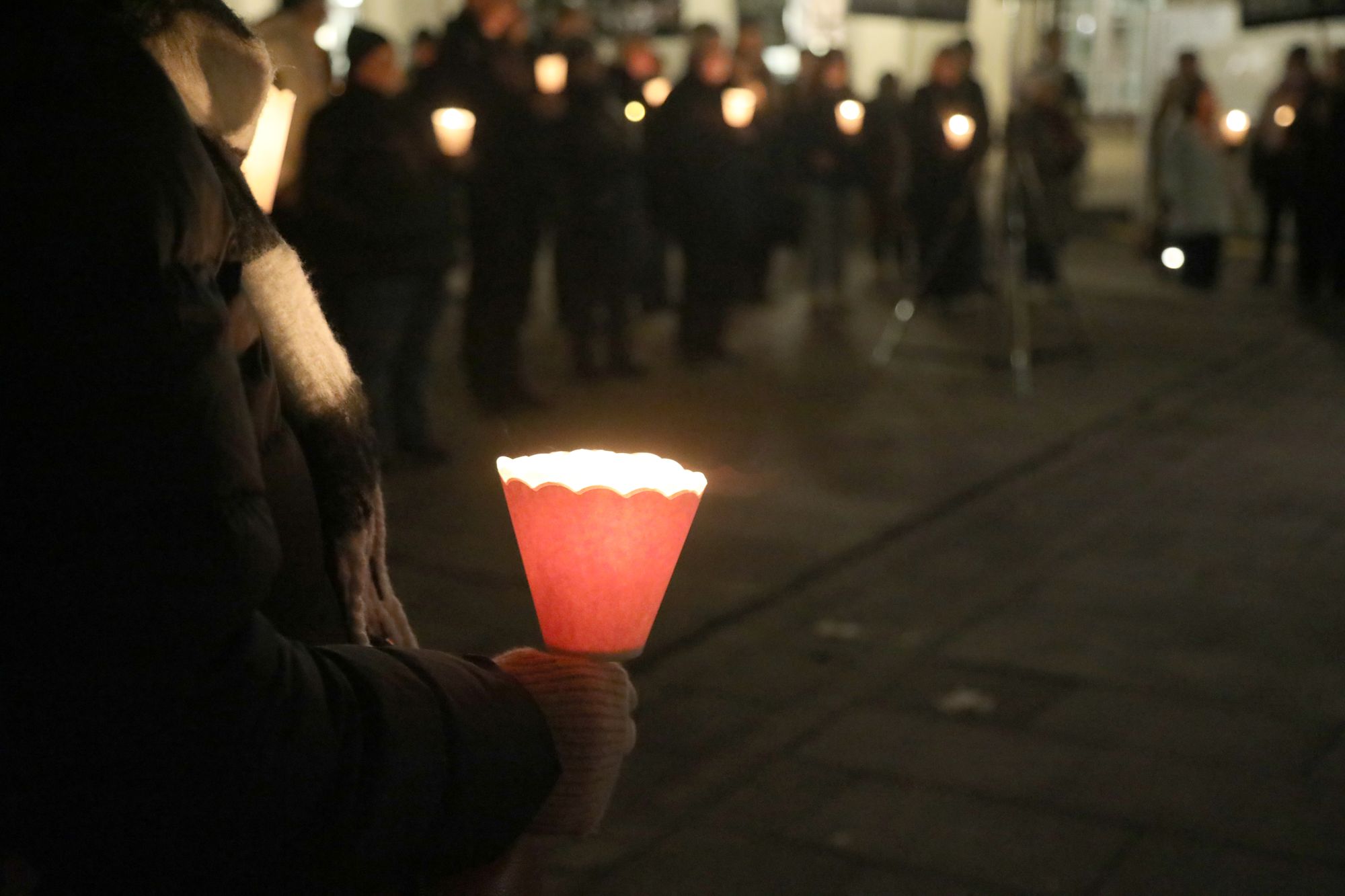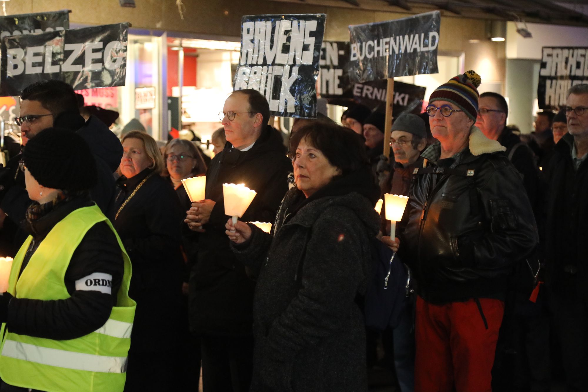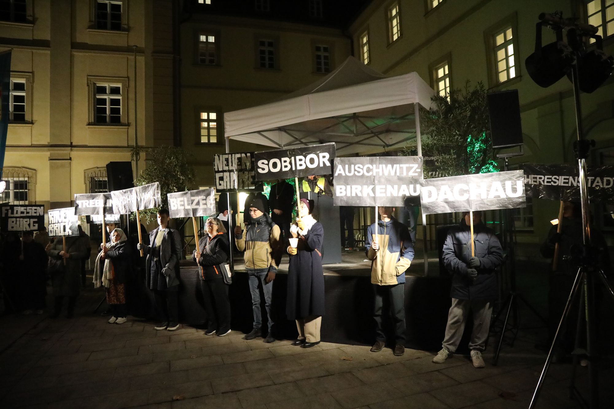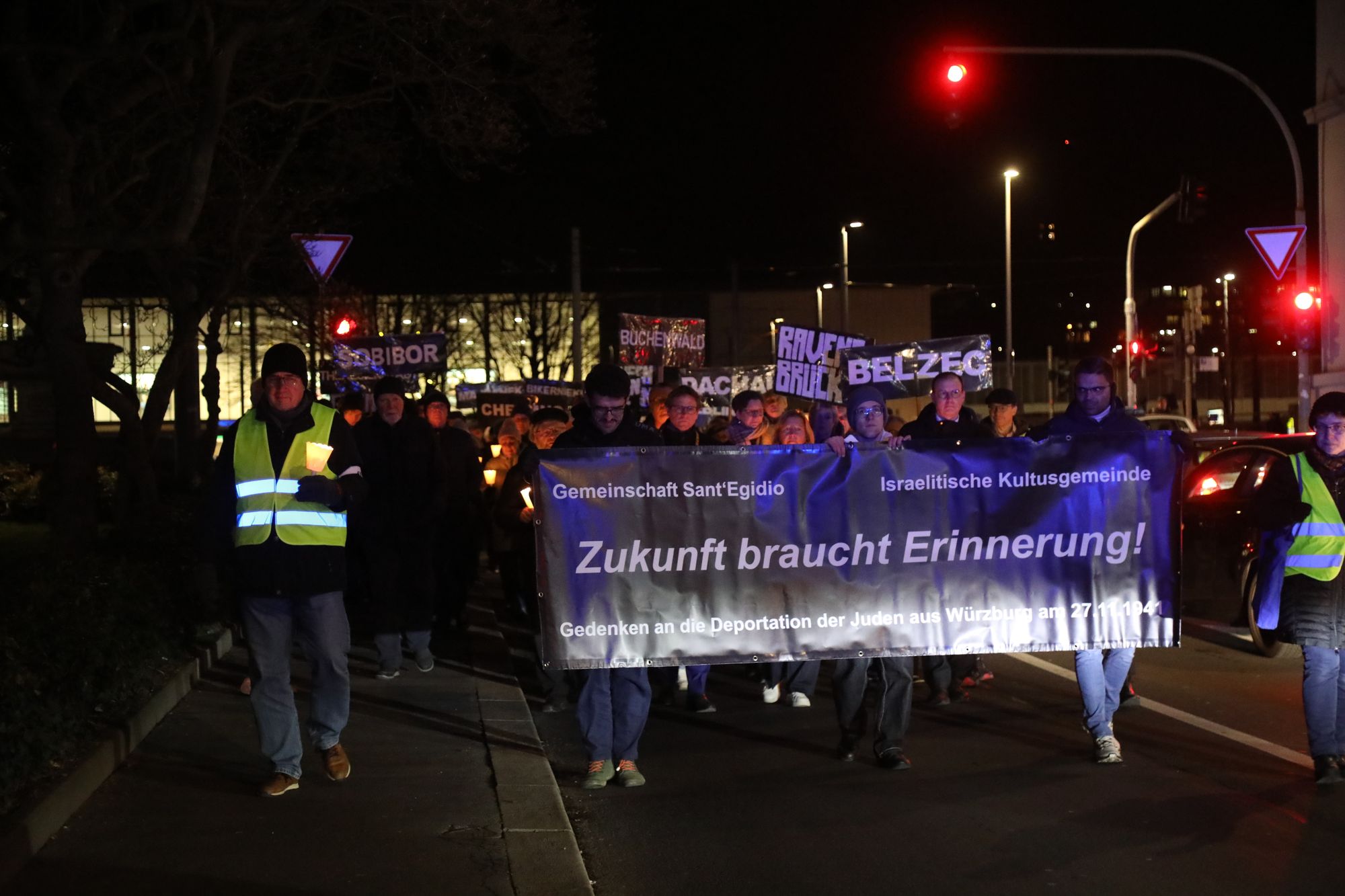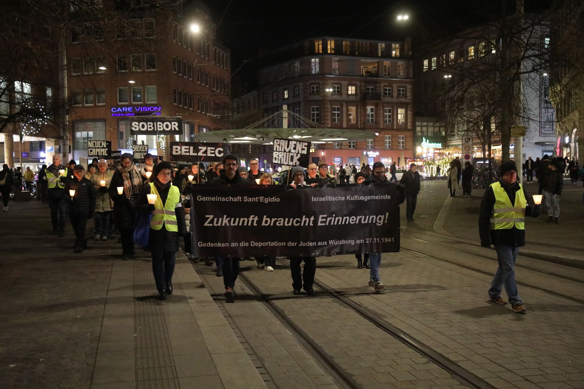 Würzburg (POW) An die erste Deportation von Jüdinnen und Juden aus Würzburg am 27. November 1941, vor genau 84 Jahren, haben am Donnerstagabend, 27. November, die Gemeinschaft Sant’Egidio und die Israelitische Kultusgemeinde erinnert. Vom „GedenkOrt Deportationen“ am Würzburger Hauptbahnhof zogen nahezu 150 Menschen mit Kerzen in den Händen durch die Innenstadt zum Rathaushof. Einige trugen Schilder mit den Namen der nationalsozialistischen Konzentrationslager, in denen jüdische Menschen aus Unterfranken getötet wurden. Die Veranstaltung stand unter dem Motto „Zukunft braucht Erinnerung“.