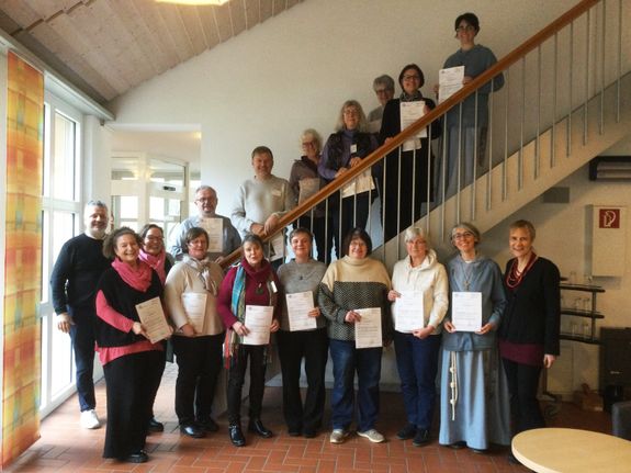 Würzburg/Schmerlenbach (POW) Insgesamt 18 ehrenamtlich engagierte Frauen und Männer aus dem ganzen Bistum haben das Pastorale Grundseminar (PGS) 2025/2026 beziehungsweise Module des Seminars absolviert. Es stand unter der Überschrift „Herausforderungen heutiger Pastoral mit Lust und Freude angehen“. 14 von ihnen überreichte Ordinariatsrätin Dr. Christine Schrappe, Leiterin der Hauptabteilung Bildung und Kultur sowie Bischöfliche Beauftragte für Erwachsenenbildung, bei einer Feierstunde am Samstag, 7. Februar, in der Hauskapelle des Tagungszentrums Schmerlenbach im Namen der gesamten Diözesanleitung die Zertifikate. Das nächste Pastorale Grundseminar beginnt im November 2026. Das schreibt die Abteilung Fortbildung und Begleitung der Diözese Würzburg.