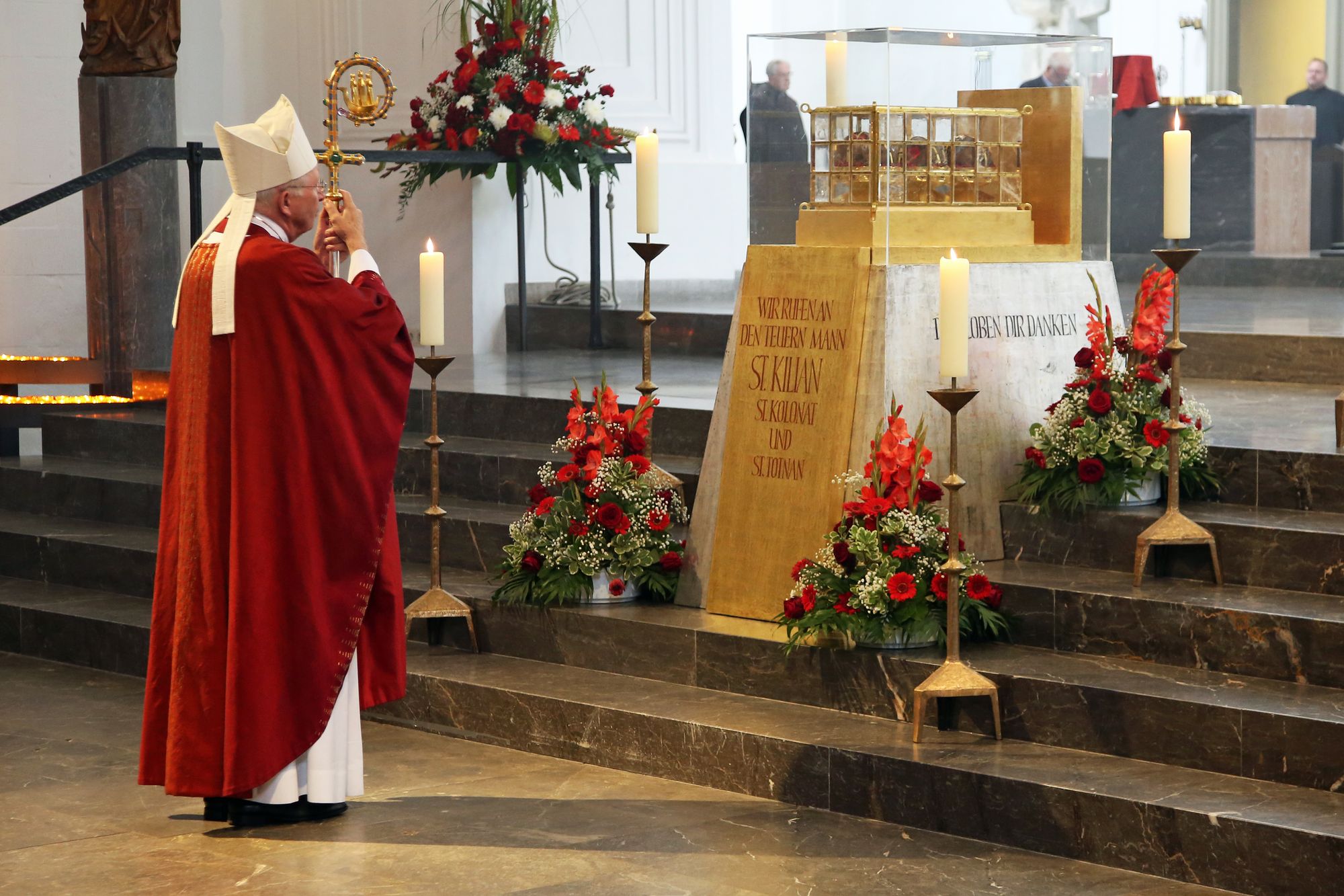 Anlässlich des 400-jährigen Bestehens der Universitätsbibliothek Würzburg seien in der Ausstellung „Elfenbein und Ewigkeit“ auch die alten Handschriften der ehemaligen Dombibliothek zu sehen gewesen, erzählte der Weihbischof. „Das erste Buch der Sammlung ist in der Nummerierung der Bücher das Kiliansevangeliar.“ Alle anderen Bücher, „so wichtig und gut sie sind“, seien zweitrangig. Der Heilige soll es bis in den Tod bei sich getragen haben. „Das Kiliansevangeliar ist ein Kiliansreliquiar. Erinnerung daran, wofür unsere Glaubenszeugen im wahrsten Sinn des Wortes den Kopf hingehalten haben.“ Auch die Frauen und Männer in den Ordensgemeinschaften und in der Mission seien regional und weltweit Zeugen für die Frohe Botschaft.