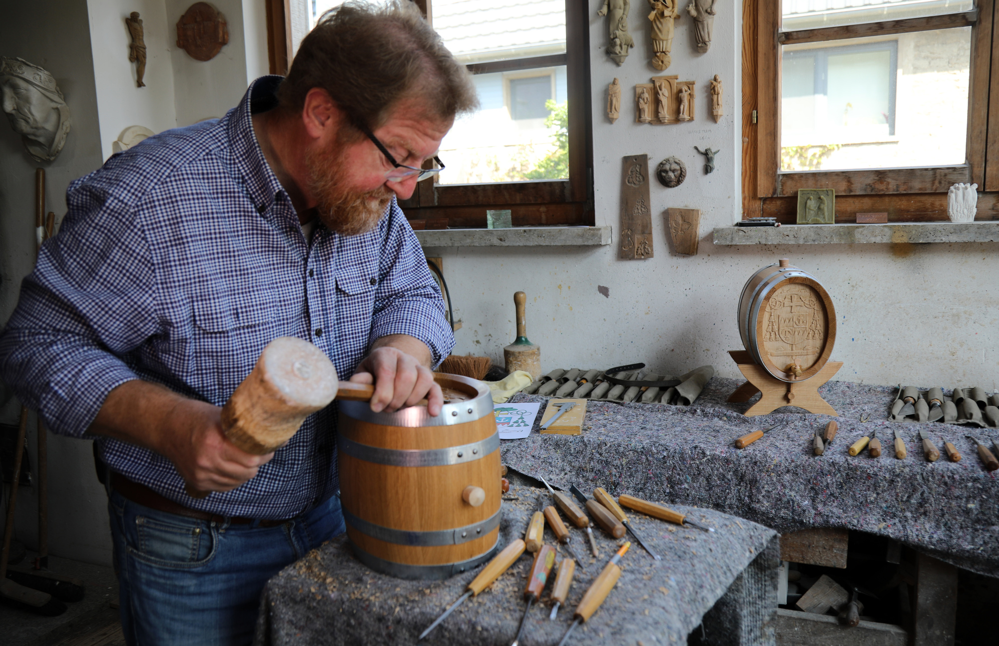 „Es ist schon der dritte derartige Auftrag, den ich für das Bistum Würzburg ausführen darf“, erzählt der Künstler. Schon für Bischof Dr. Friedhelm Hofmann und Weihbischof Ulrich Boom hat Grimm das Wappen als Schnitzerei in Fässchen gezaubert. Und auch diesmal ist es eine recht knifflige Sache. In zwei Tagen Arbeit hat der Eußenheimer Büttnermeister Andreas Aßmann (47) aus abgelagerter Eiche in Handarbeit die beiden Zehn-Liter-Fässer zusammengesetzt. Und bei der Übergabe an den Schnitzer darauf hingewiesen, dass das Wappen jeweils maximal vier Millimeter tief in das Holz eingeschnitten werden darf – „sonst sind Stabilität und Dichtheit nicht mehr gewährleistet“. Mit der Schieblehre überprüft Grimm in regelmäßigen Abständen, ob alles im grünen Bereich ist.